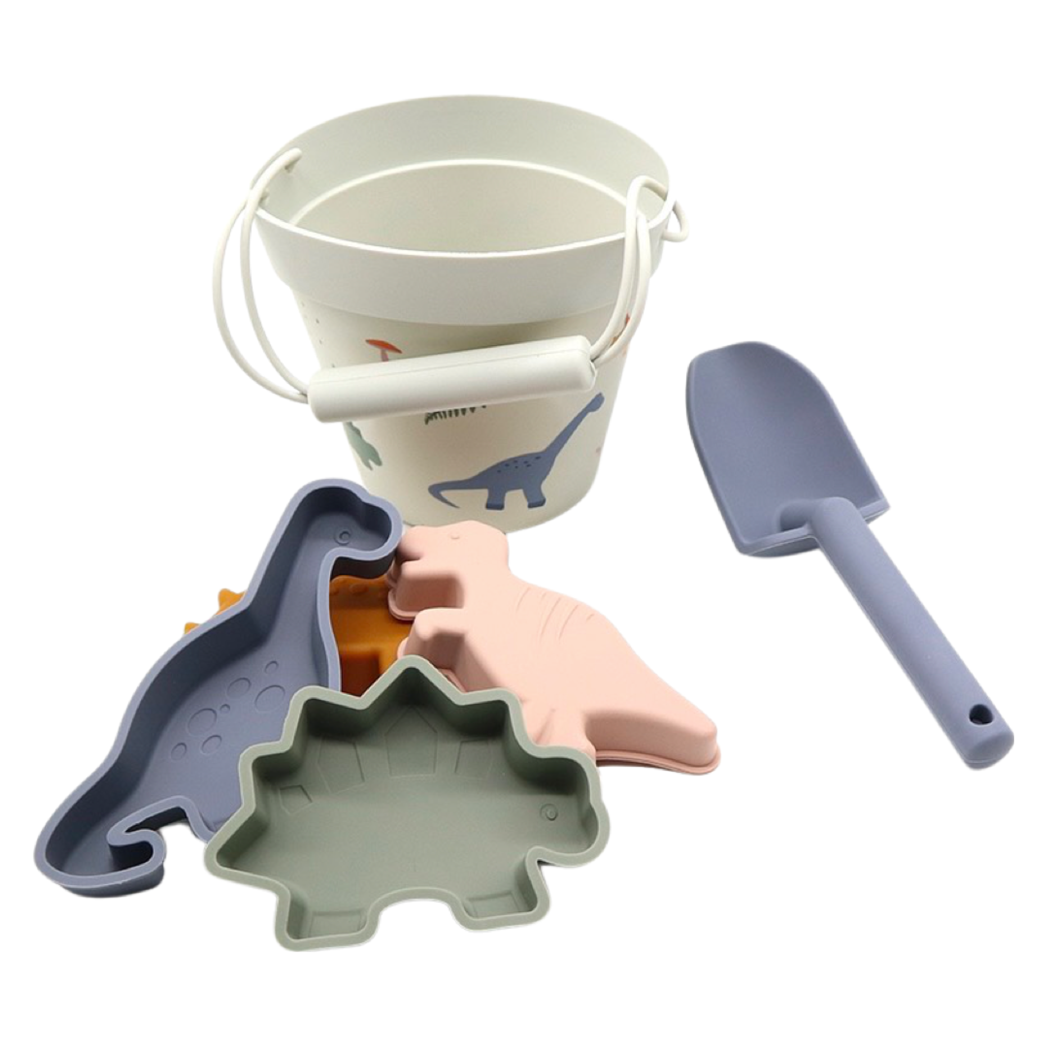 Durable and bendable material, easy to store.Set includes a bucket with handle, four moulds and a shovel.