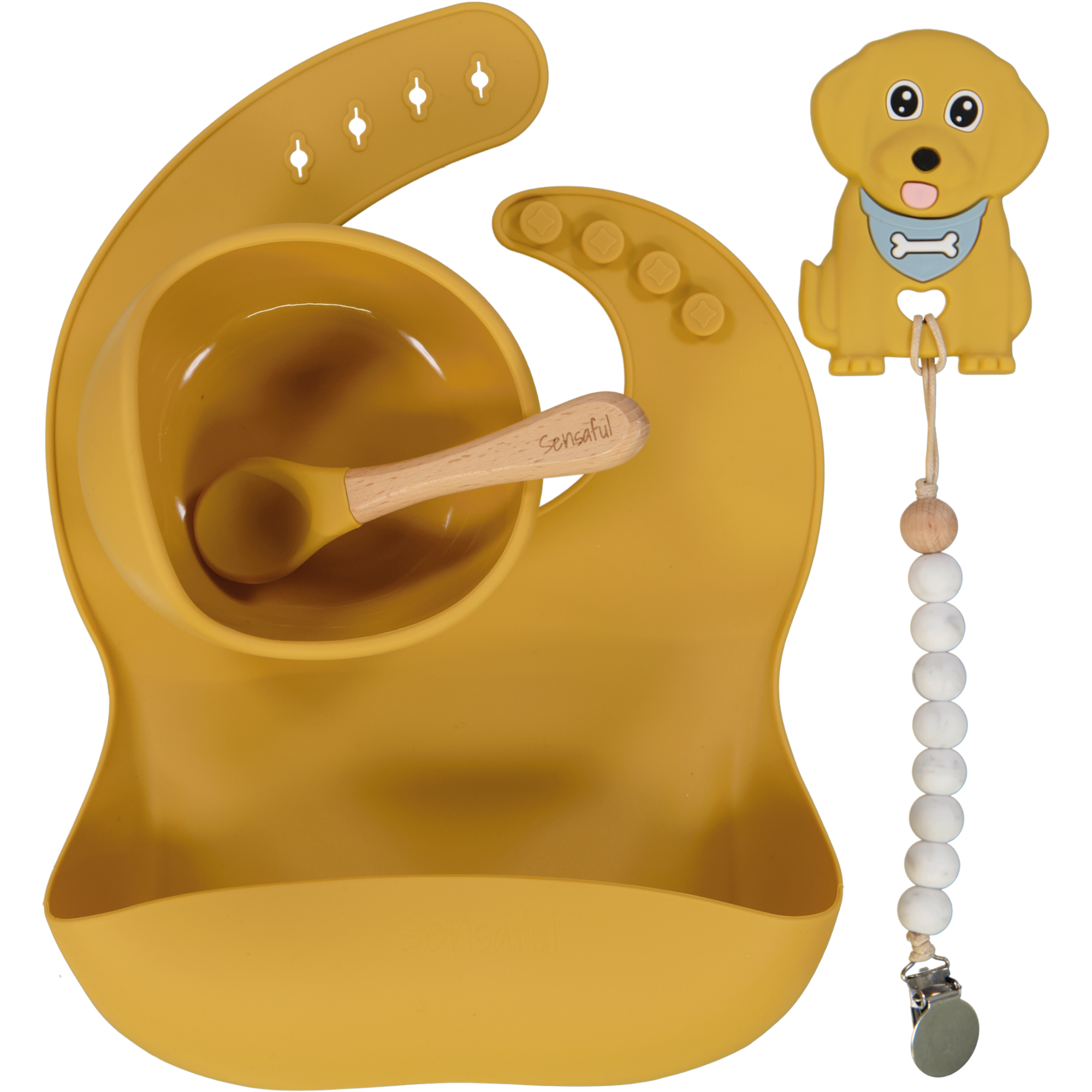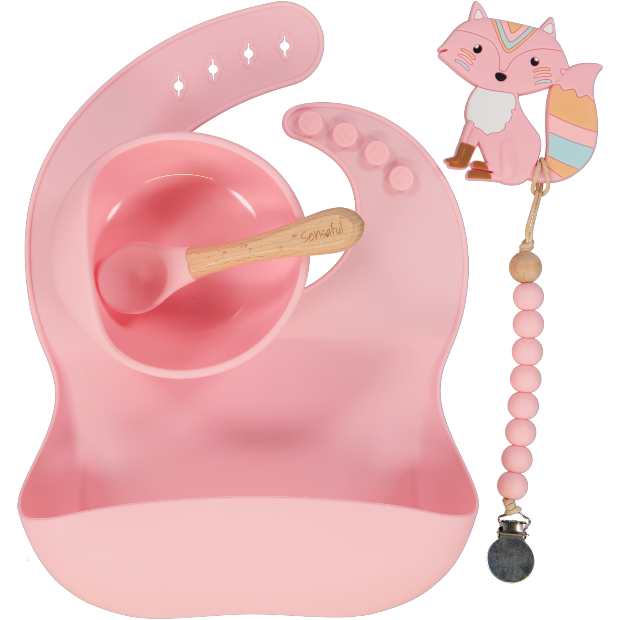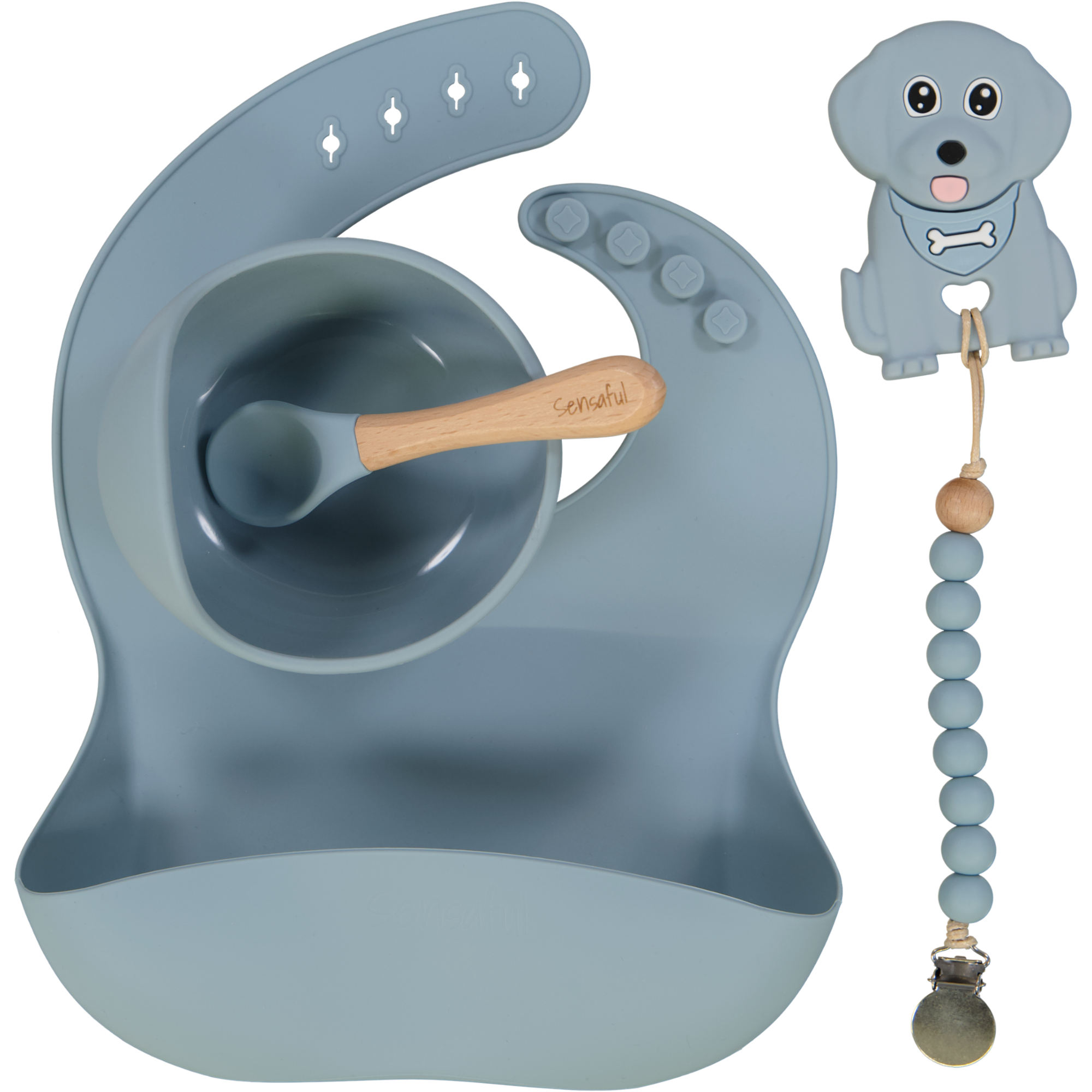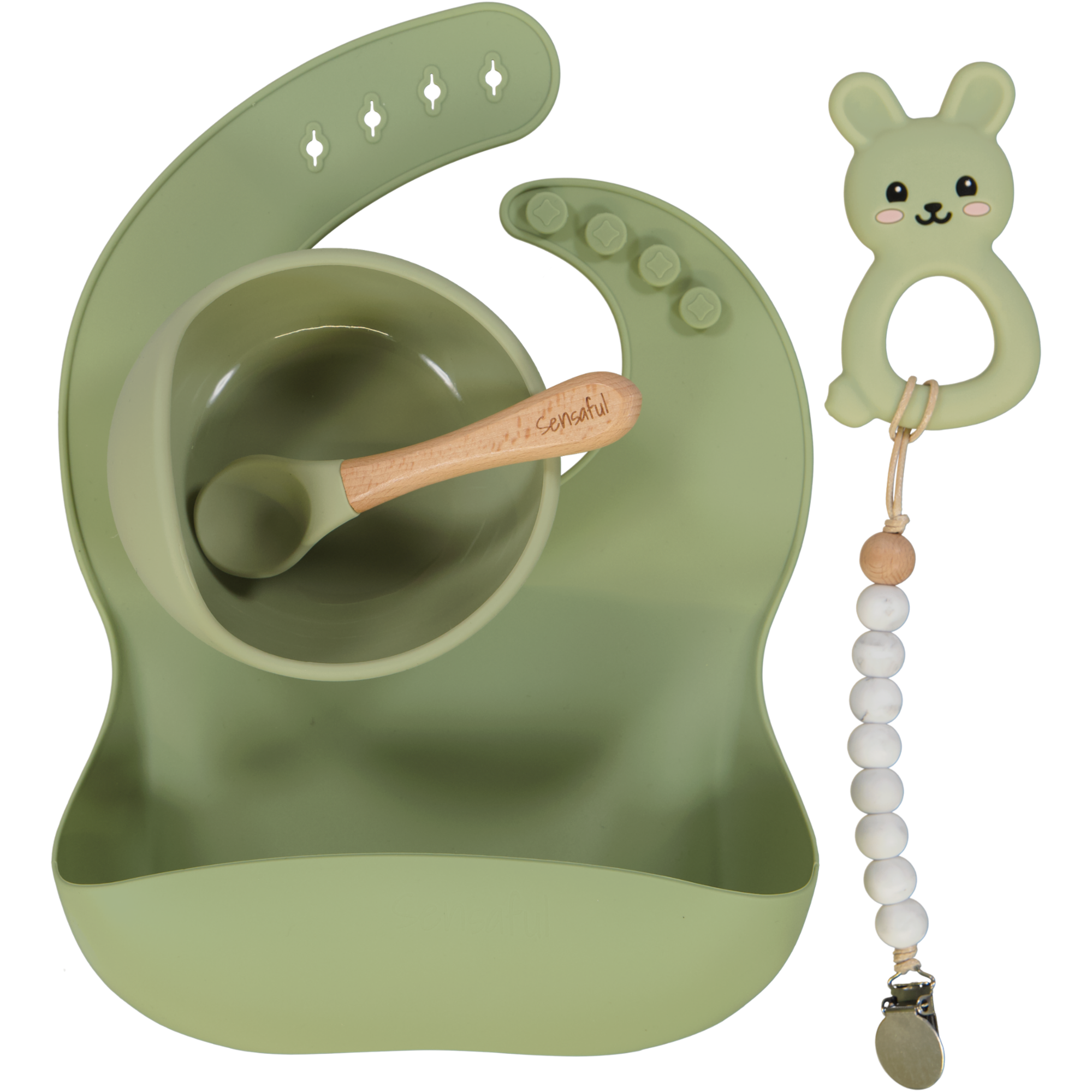 (Bowl) Made from food grade silicone. The bottom of the bowl has a solid suction cup, and curved edge of the bowl is designed to prevent baby from knocking over the food.