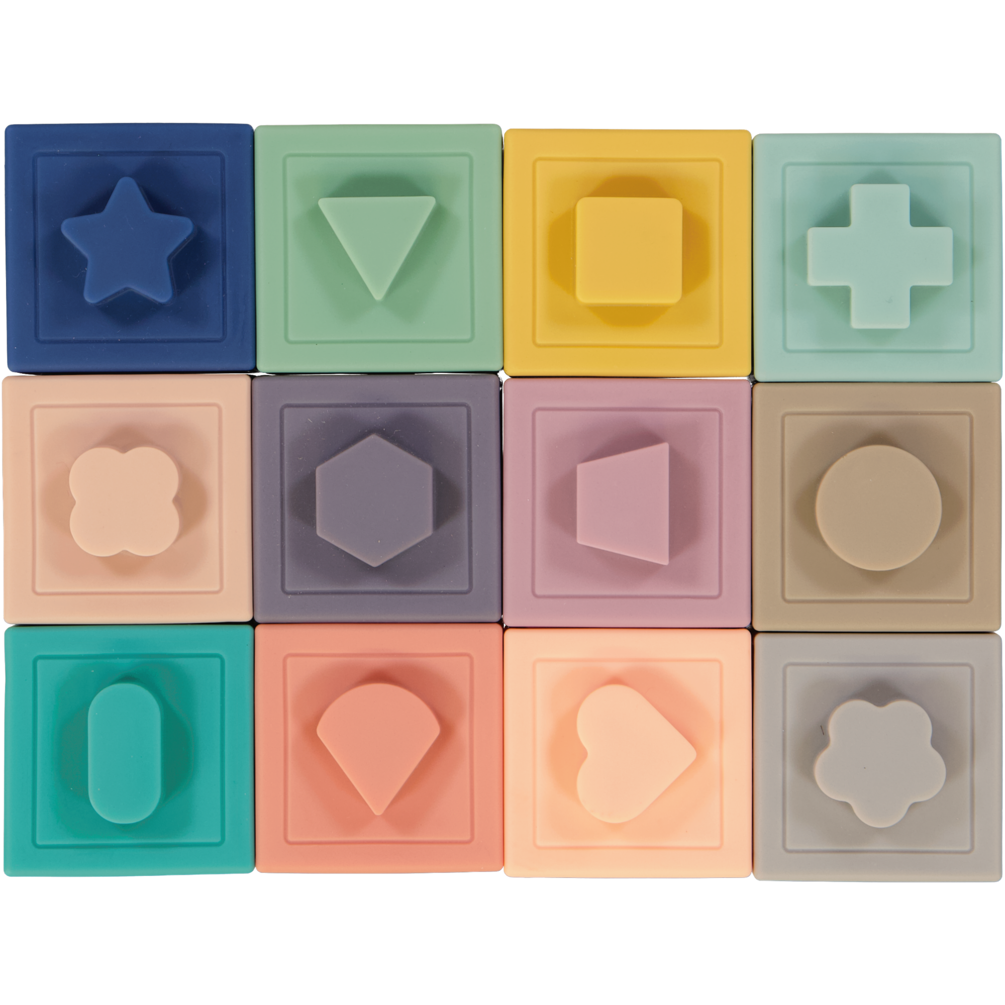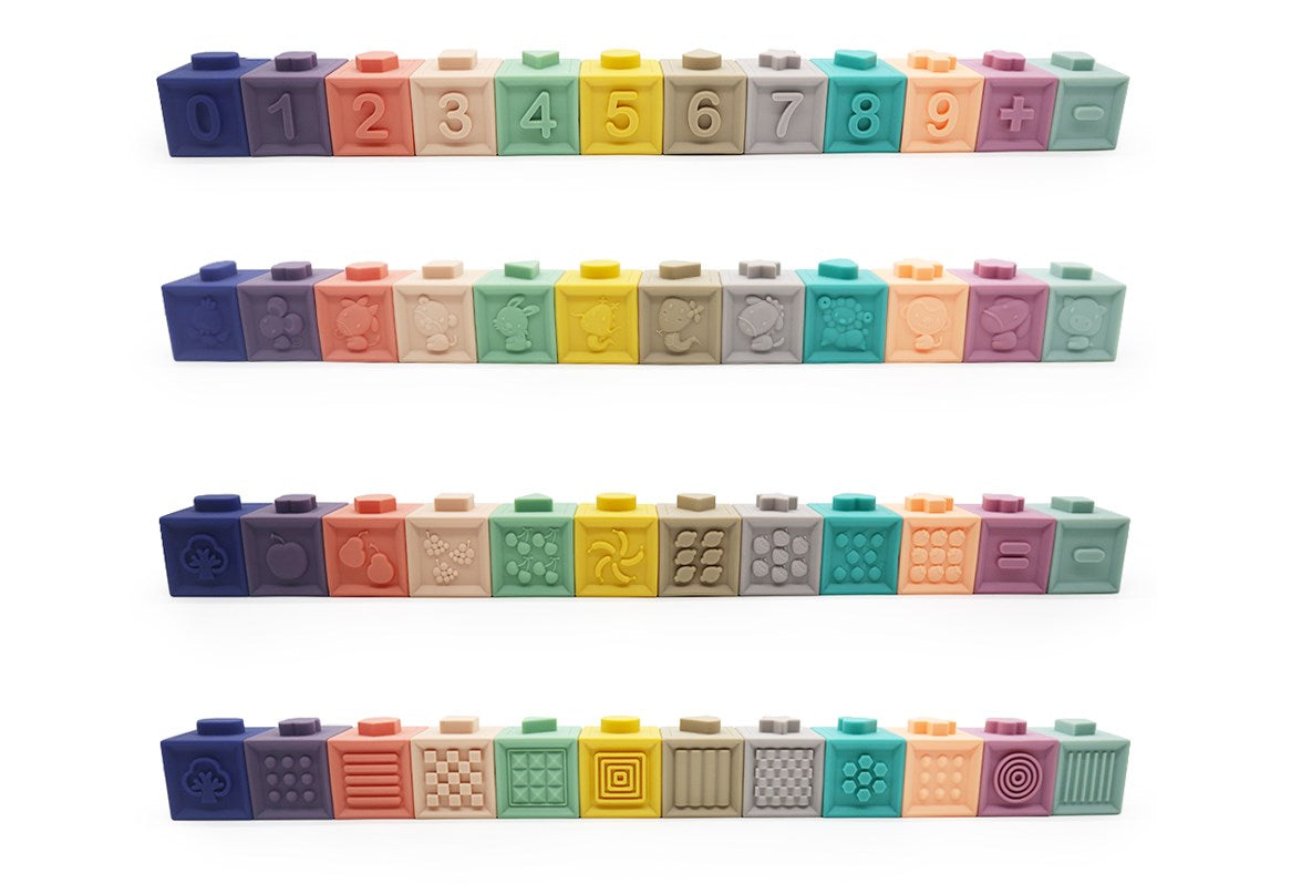 Stackable fun shapes on each cube (each block has raised pictures of animals, numbers, shapes, fruits and textures on them).