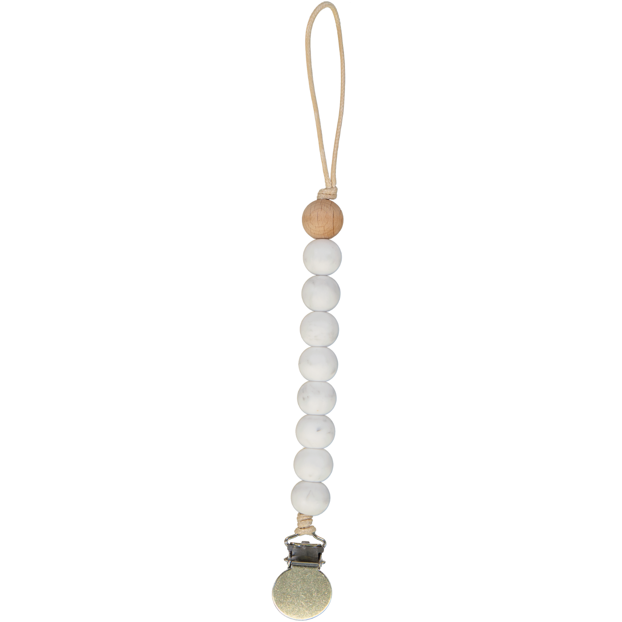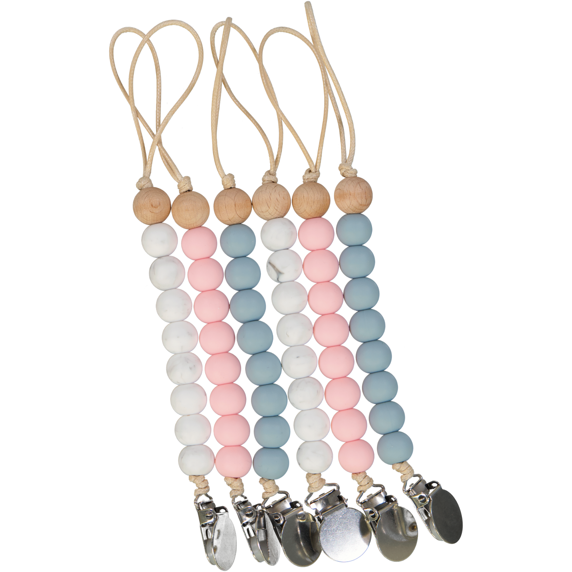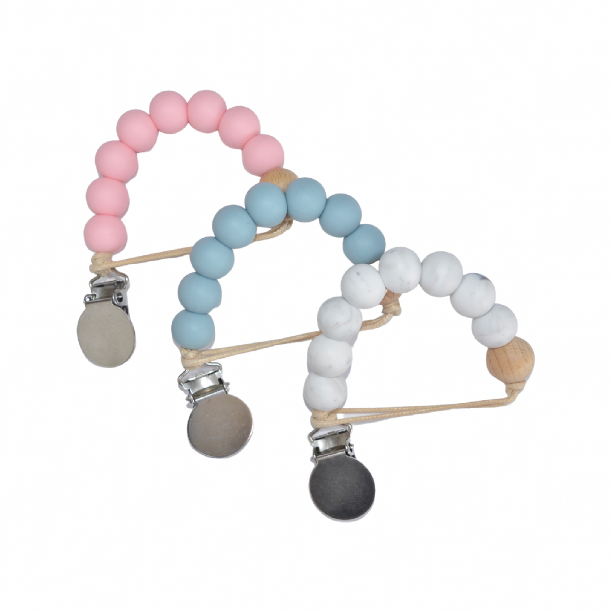 The silicone pacifier clip is 100% BPA free food grade silicone + round stainless steel clip. It is 100% non-toxic, and approved by FDA/ SGS/LFGB/CE.